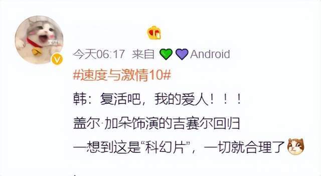 莫得错,在《速激6》点火的吉赛尔《速激10》中回生了,盖尔·加朵演了神奇女侠之后就有了超才略了?由姜成镐扮演的韩能死而回生,那韩的女一又友也能死而回生呗。